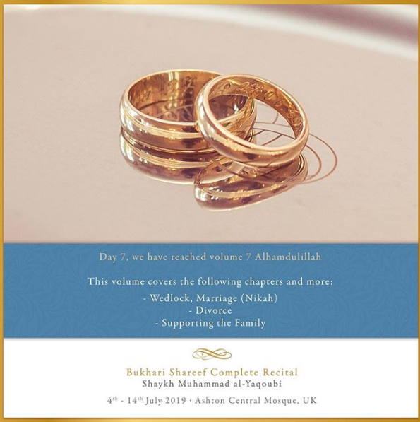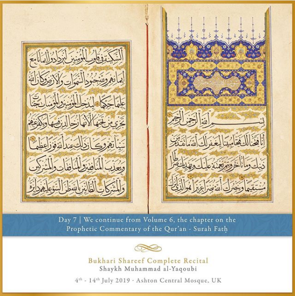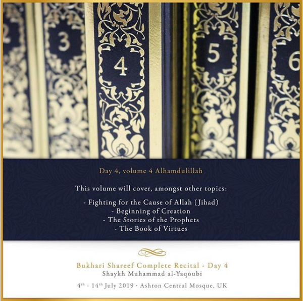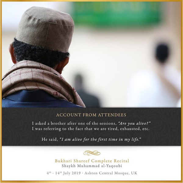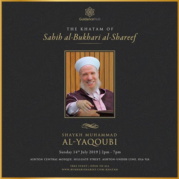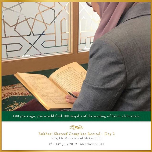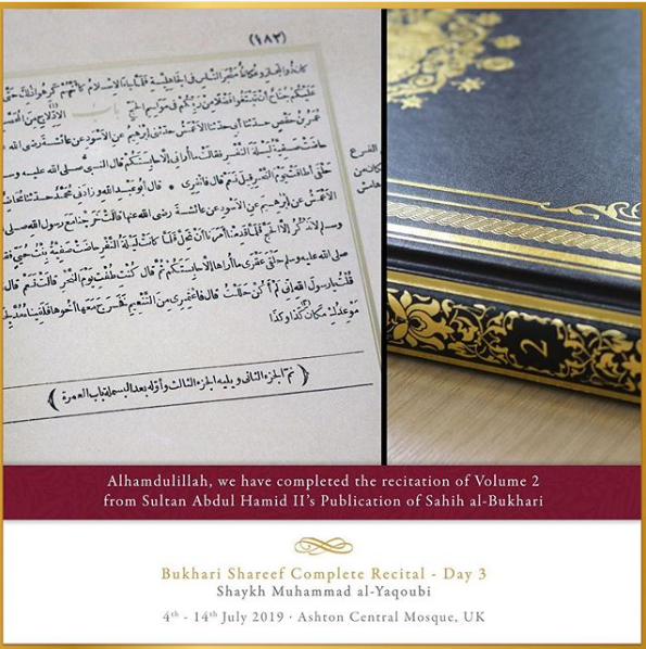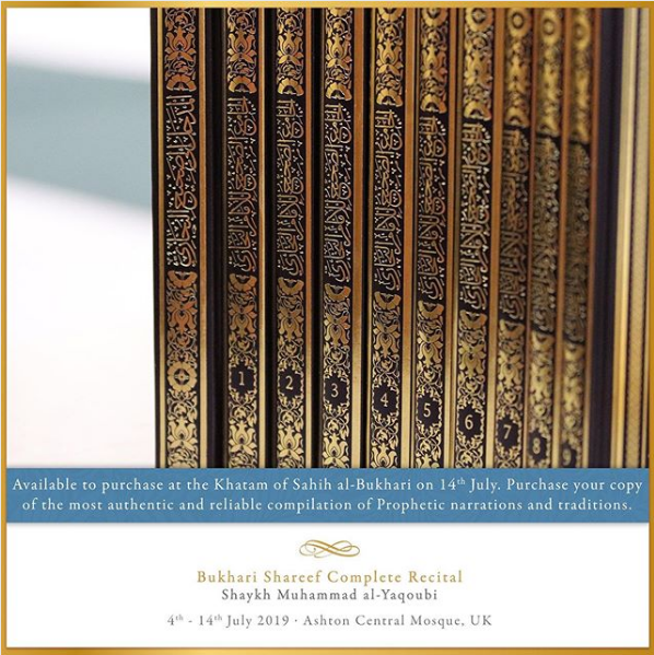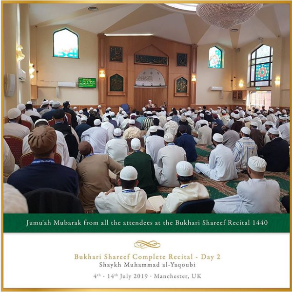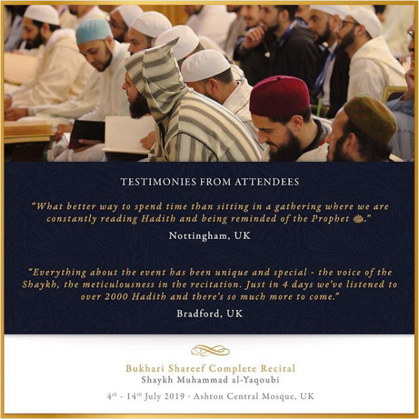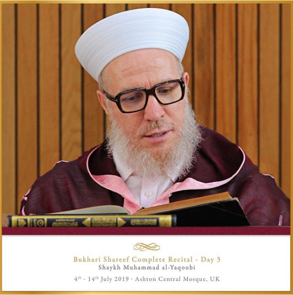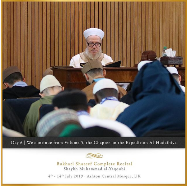 The Ashton Central Mosque had the honour of hosting the full recital of Sahih al-Bukhari in July 2019. Led by the Muhaddith, Alim, Shaykh, Sayyid Muhammad al-Yaqoubi alongside Shaykh Faisal Hamid Abdul Razzaq (Canada) and Shaykh Dr Gibril Fuoad Haddad (Brunei). Students from across the UK and globe attended in waves to participate in this rare landmark and prestigious event of reviving the traditional methods of reciting, teaching, preserving and transmitting the correct and most authentic version of Sahih al-Bukhari.